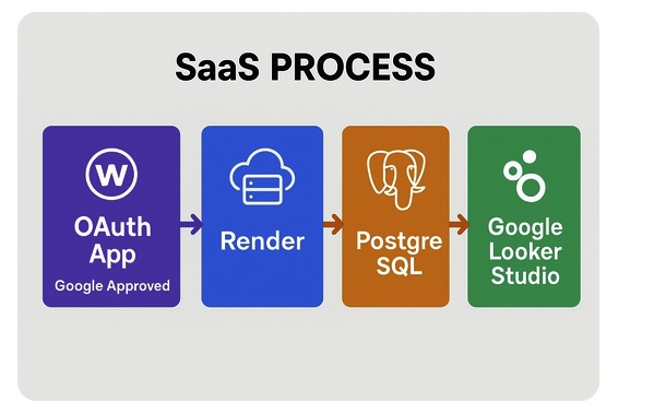 Note: the diagram below illustrates the typical flow — WordPress (OAuth app) → Render (app server) → PostgreSQL (database) → Google Looker Studio (BI).