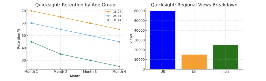 The next set of charts below are from Google Looker Studio. Notice, what you are looking at are only two graphs showing data points. The graph to the right is more telling because it answers the question: “What regions (locations around the world) are my viewers coming from?”